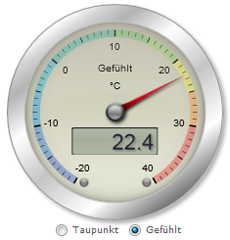 Anzeige kann zwischen errechnetem Taupunkt und gefühlter Temperatur umgestellt werden. |