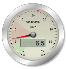Der grüne Bereich in der Skala zeigt die durchschnittliche Windgeschwindigkeit der letzten 5 Minuten